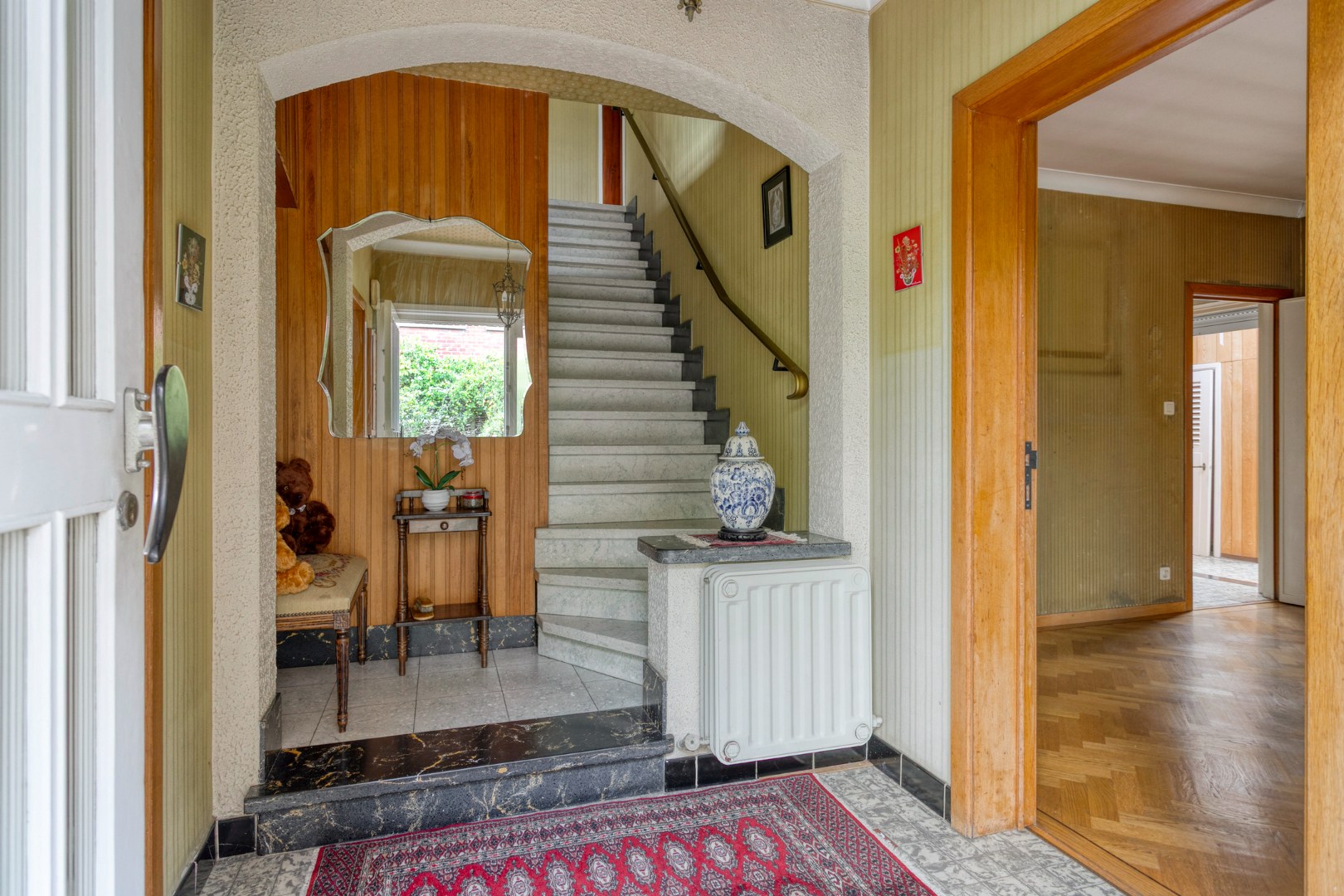 Achteraan is een ruime leefruimte met een warme parketvloer uitbreidbaar met de aanpalende veranda en ernaast de de keuken. Op de verdiepingen zijn 4 slaapkamers, een badkamer en een zolder die nog kan ingericht worden al 5de slaapkamer. En plus een praktische proviandkelder, een afzonderlijke garage met bijgebouwen.